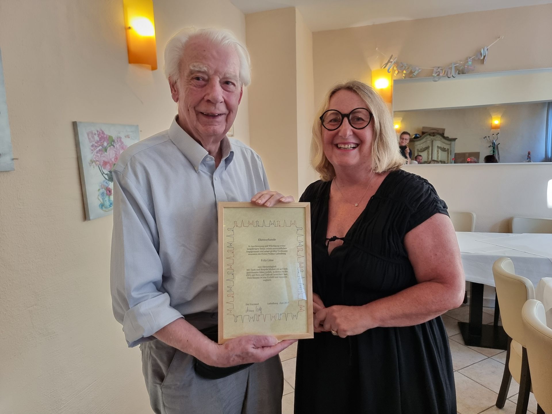 Freie Wähler Ladenburg ernennen ihre Mitglieder Fritz Lüns und Gudrun Ruster zu Ehrenmitgliedern. Damit würdigen die FW das langjährige Engagement der beiden Alt-Stadträte für die Freien Wähler, für ihre Mitbürger und für die Stadt Ladenburg.